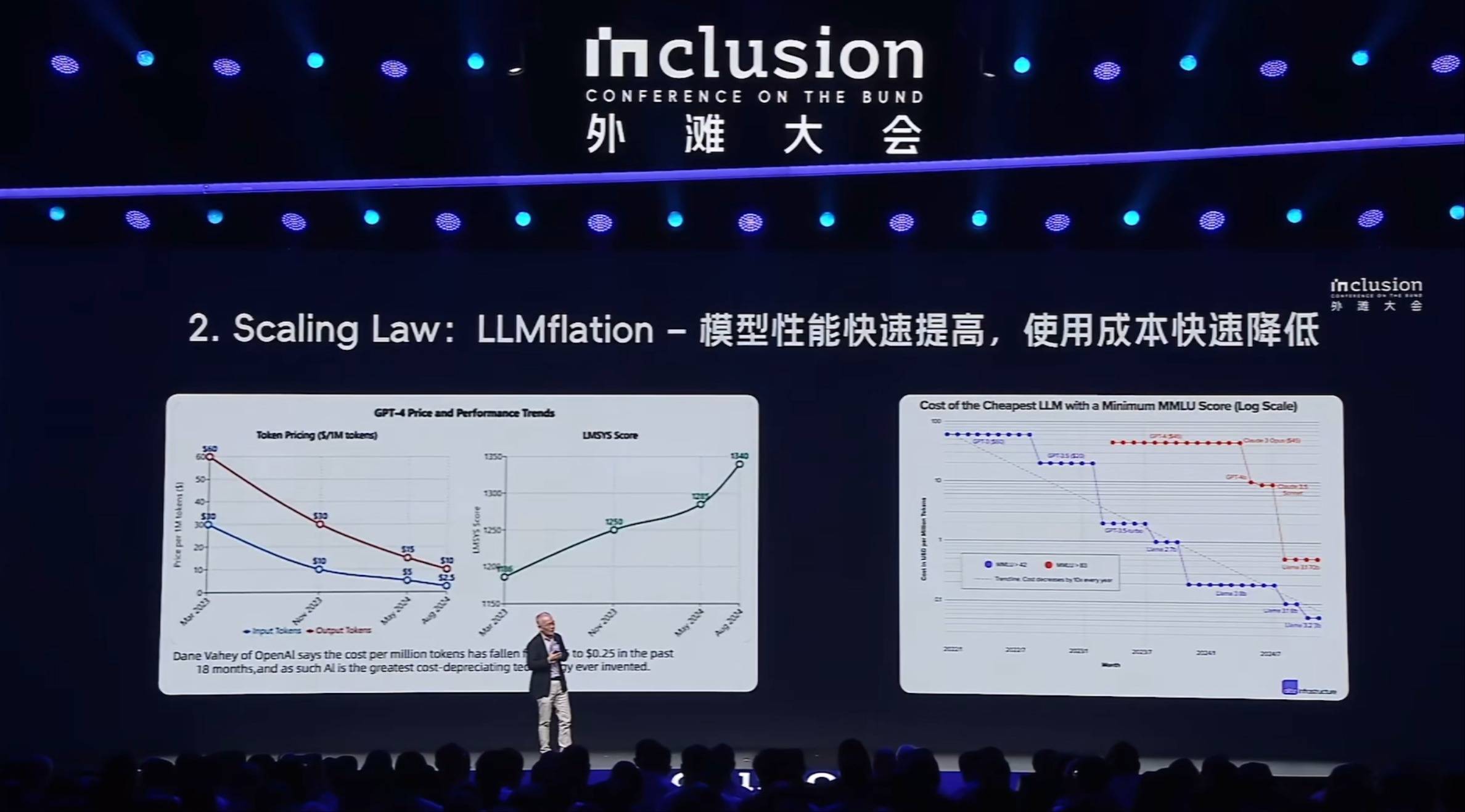 过去几年内,大语言模型推理的成本在持续降低,这个降低非常惊人。张宏江提到这个定律就是LLMflation,模型性能快速提高时,使用成本会快速降低。