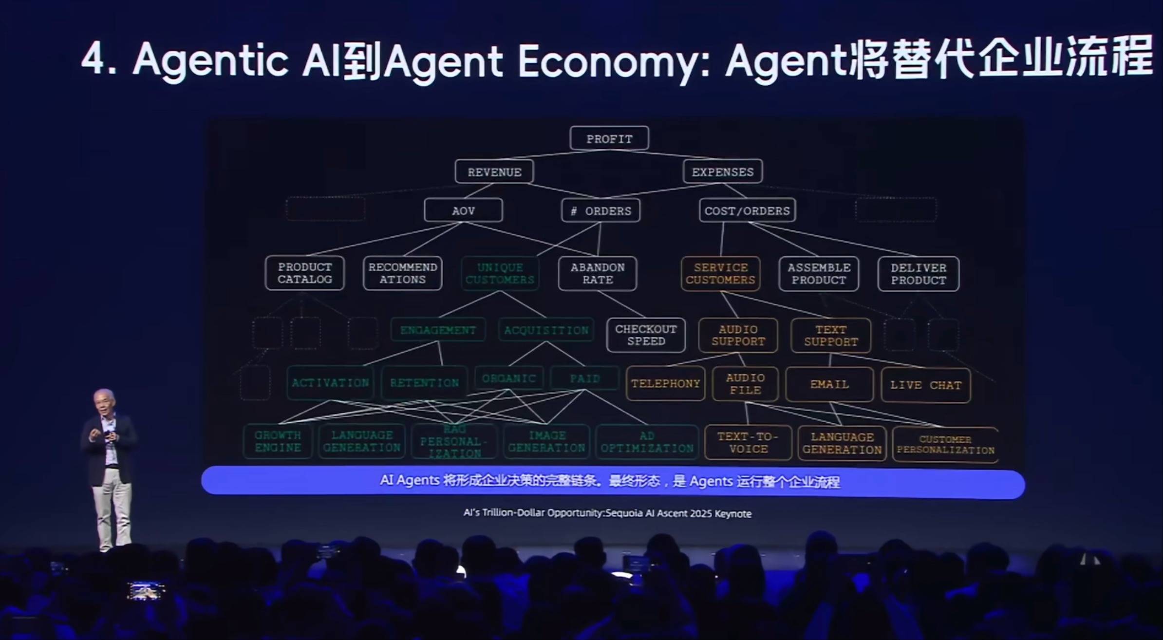 Agent经济对社会的影响在于,目前机构的重要资产是人才,未来会变成算力、模型、数据,现在企业想要扩大业务会雇佣更多人才,未来就是要扩大算力规模、模型更强大、数据更丰富。当一个人和一堆Agent组成一个公司,会实现前所未有的效率跃升。