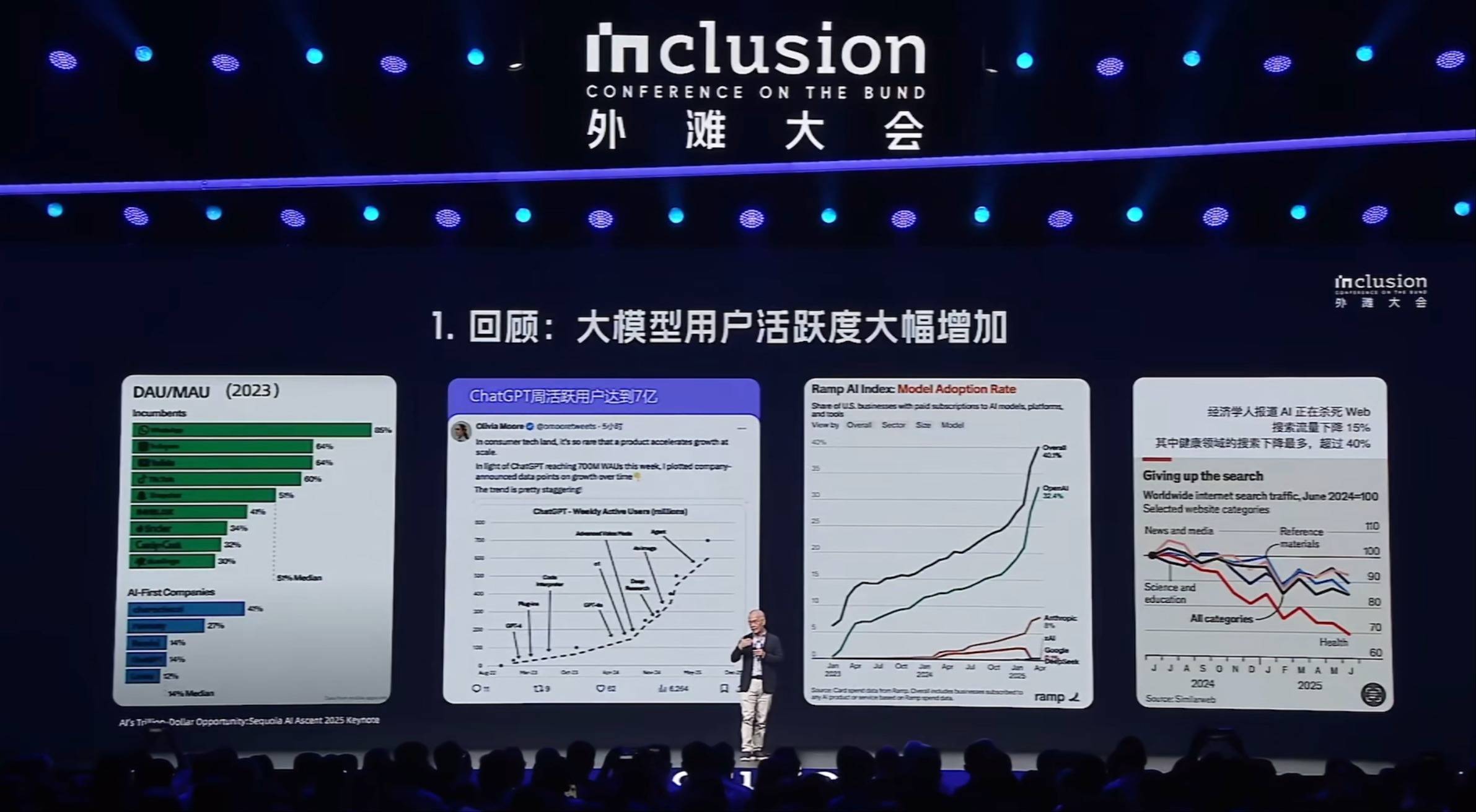 从公司角度,大模型在公司中的普及率也在快速增加。当推理模型发布后,OpenAI、Anthropic的用户都在快速成长,今年是大模型应用普及的转折点。